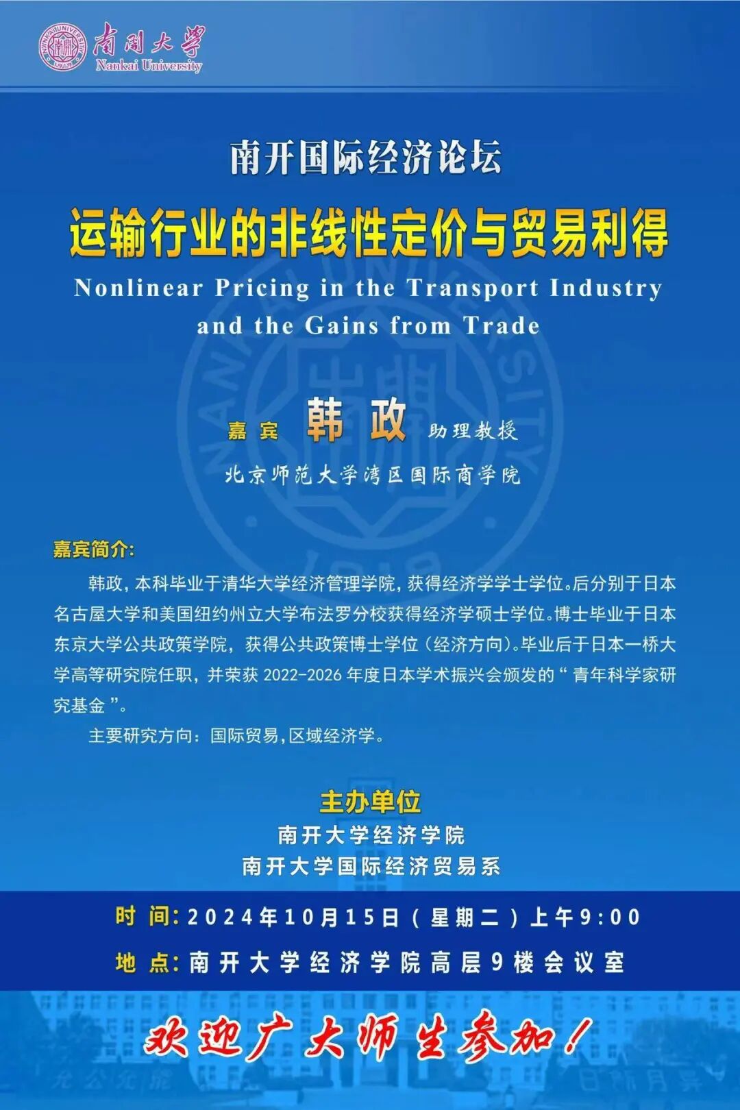 讲座预告 | 南开国际经济论坛:运输行业的非线性定价与贸易利得
